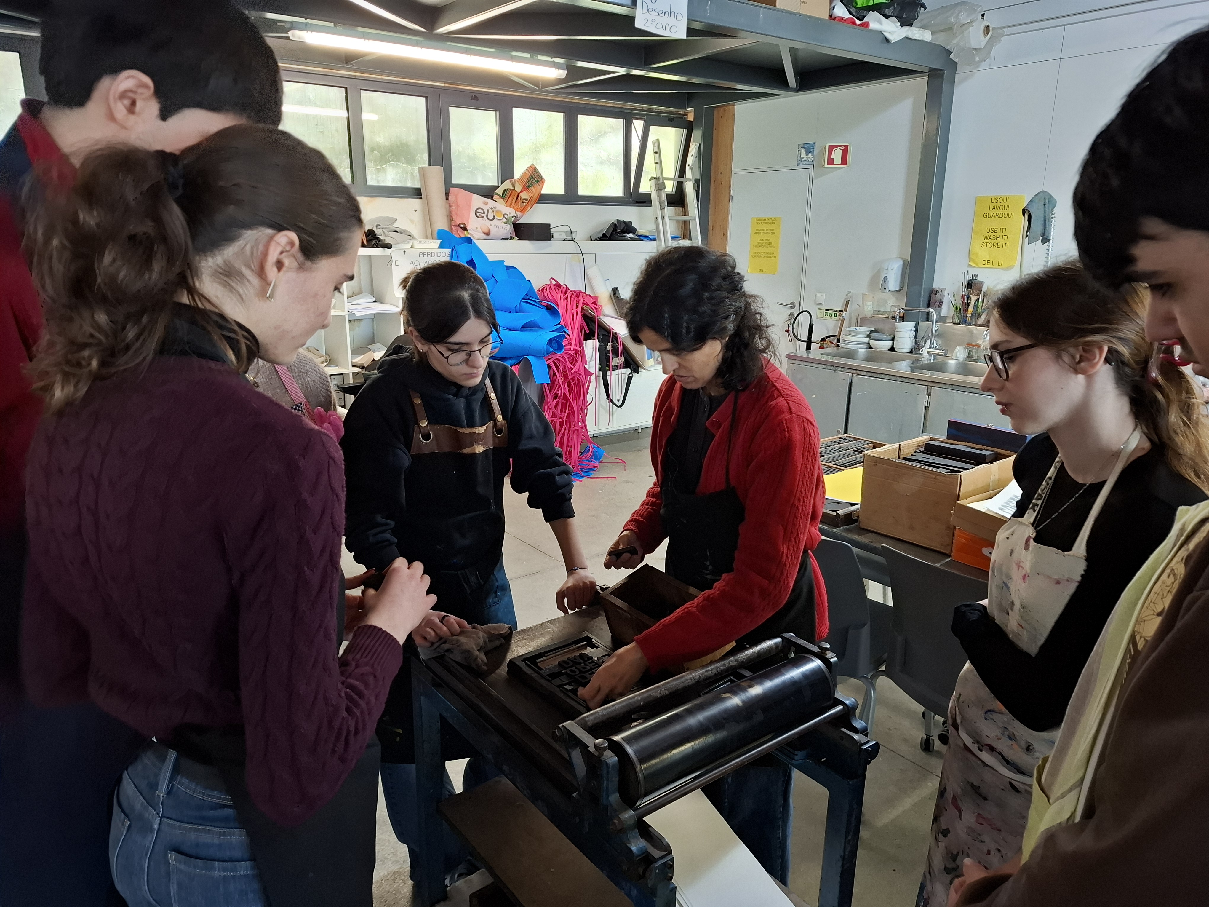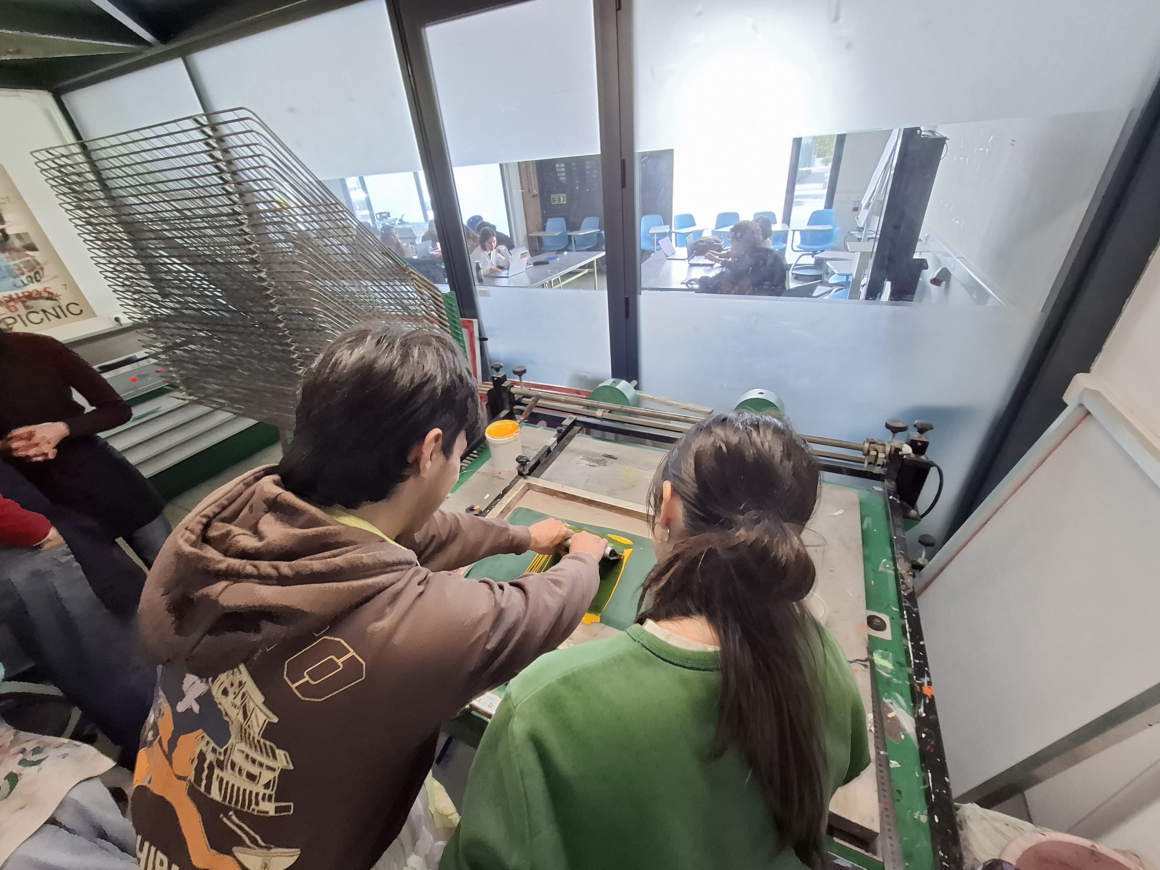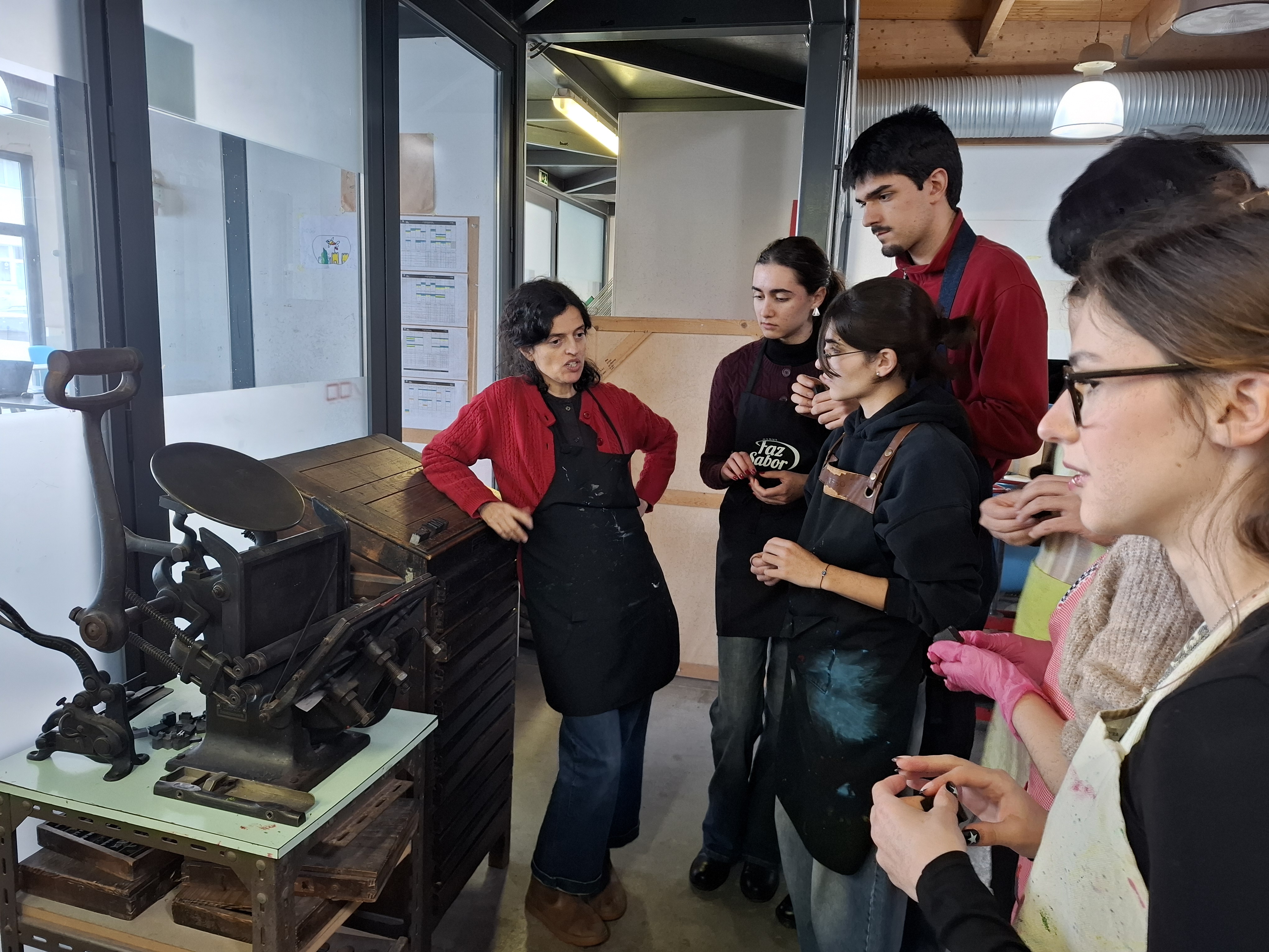 No dia 9 de março de 2026, a turma 12º12 do Curso Científico-Humanístico do Ramo de Artes Visuais 25/26, realizou um Workshop de Serigrafia e Letter Press nas instalações da Editora Delli Press da Universidade Lusófona de Lisboa, no âmbito da disciplina de Oficina de Artes. Com o intuito de proporcionar o contato direto com práticas de impressão artesanais aplicadas à Ilustração e ao Design de Comunicação Contemporâneo, os alunos experienciaram a materialidade da Impressão Tipográfica (letter press) compondo e imprimindo com tipos móveis, assim como acompanharam o processo de gravação em Serigrafia, uma técnica apreciada por artistas contemporâneos pela sua aplicabilidade e versatilidade. Esta experiência proporcionou aos alunos a oportunidade de unir a teoria à prática, num contexto de oficina e ambiente editorial, aliado a um despertar para processos criativos alternativos na área das Artes Visuais, enriquecendo a sua aprendizagem e literacia visual que lhes permitirá transformar esse conhecimento em trabalhos e projetos com cariz mais pessoal e artístico, mesmo numa era tão digital como a que vivenciamos.