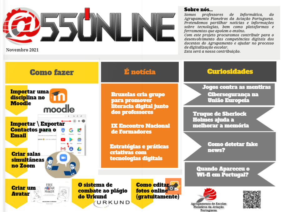 Com o objetivo de contribuir para o desenvolvimento das competências digitais dos docentes e ajudar no processo de digitalização escolar, os professores do grupo 550 - Informática, criaram uma revista digital onde irão divulgar informações sobre tecnologias, plataformas e ferramentas que apoiem o ensino. Revista novembro (Para melhor visualização)